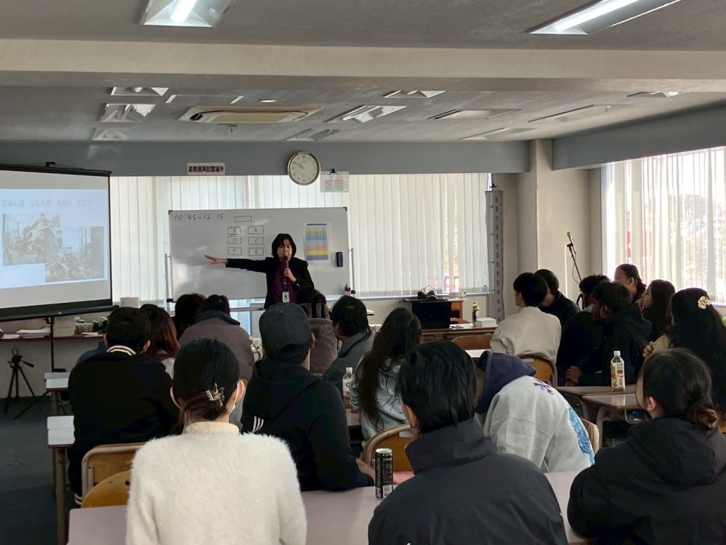 防災士の水谷浩子さんが講師をして、学生たちに、防災の大切さを学ぶためのワークショップをひらきました。
